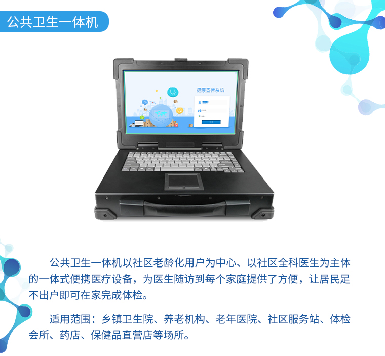 專為國家基本公共衛生服務研發的智能設備,讓用戶足不出戶即可完成全套體檢。該設備由血壓計、血糖儀、血氧儀、耳溫槍、體重計、尿液分析儀等多種檢測儀器組合而成,可自動識別二代身份證內所有信息,生成居民健康檔案。